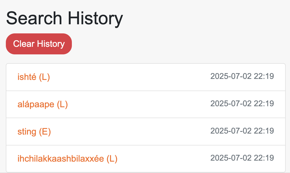 Your search and entry history is saved automatically. Click the History button in the menu to view words and entries you've recently looked up. This helps you revisit and review words you've explored before.
