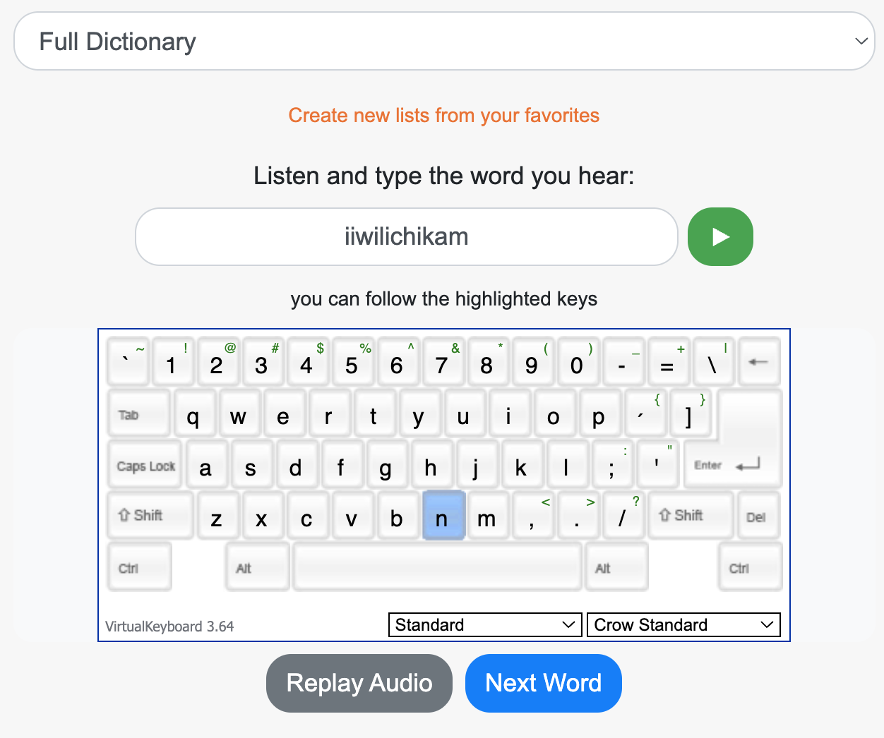 Typing Practice helps you learn to spell and type words in Crow. Click the Typing Practice button in the menu to begin. Listen to the audio, then type the word you hear using your keyboard or the onscreen keyboard. Get instant feedback and corrections, and try the next word to keep practicing!