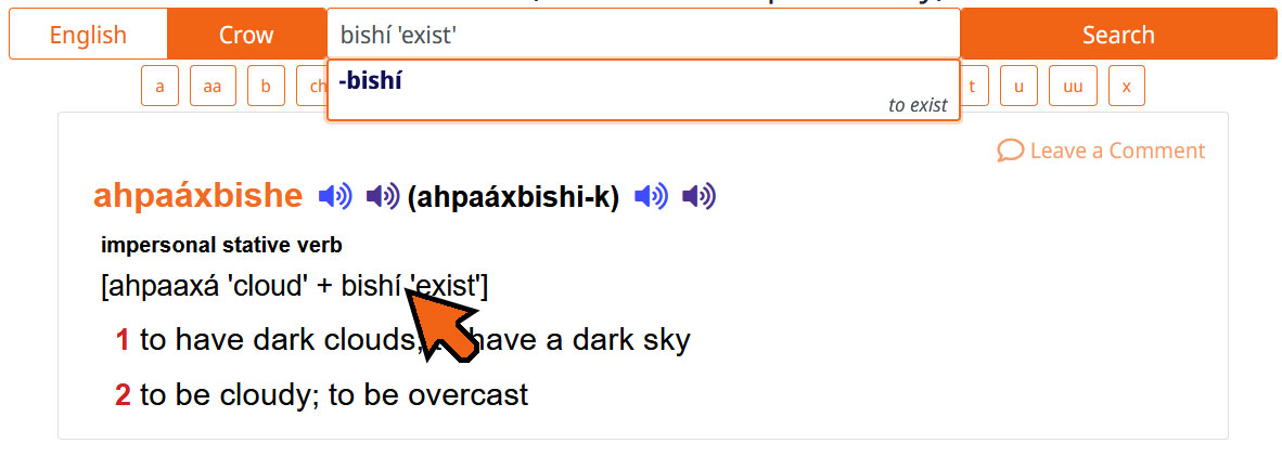 Click on words within an entry to search for those Crow or English words within the dictionary. Hit Enter or Click the result to proceed to the entry.